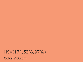 HSV 17°,53%,97% Color is a light orange color and the nearest color is Light Salmon #ffa07a. Hex code #f79974 and RGB value is rgb(247,153,116). In RGB color space, this color is composed of 97% red, 60% green, 45% blue, In CMYK color space, this color is composed of 0% cyan, 38% magenta, 53% yellow , 3% black , In HSL color space, this color has a hue angle of 17° , 89% saturation and 71% lightness.