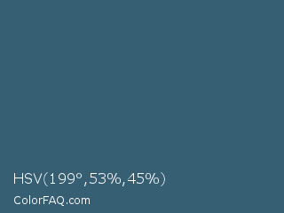 HSV 199°,53%,45% Color is a normal blue color and the nearest color is William #3a686c. Hex code #365f73 and RGB value is rgb(54,95,115). In RGB color space, this color is composed of 21% red, 37% green, 45% blue, In CMYK color space, this color is composed of 53% cyan, 17% magenta, 0% yellow , 55% black , In HSL color space, this color has a hue angle of 200° , 36% saturation and 33% lightness.