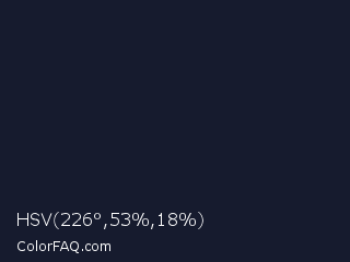 HSV 226°,53%,18% Color is a very dark blue color and the nearest color is Mirage #161928. Hex code #161b2e and RGB value is rgb(22,27,46). In RGB color space, this color is composed of 9% red, 11% green, 18% blue, In CMYK color space, this color is composed of 52% cyan, 41% magenta, 0% yellow , 82% black , In HSL color space, this color has a hue angle of 228° , 35% saturation and 13% lightness.
