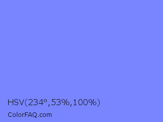 HSV 234°,53%,100% Color is a light blue color and the nearest color is Cornflower Blue #6495ed. Hex code #7885ff and RGB value is rgb(120,133,255). In RGB color space, this color is composed of 47% red, 52% green, 100% blue, In CMYK color space, this color is composed of 53% cyan, 48% magenta, 0% yellow , 0% black , In HSL color space, this color has a hue angle of 234° , 100% saturation and 74% lightness.