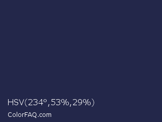 HSV 234°,53%,29% Color is a very dark blue color and the nearest color is Space Cadet #1d2951. Hex code #23274a and RGB value is rgb(35,39,74). In RGB color space, this color is composed of 14% red, 15% green, 29% blue, In CMYK color space, this color is composed of 53% cyan, 47% magenta, 0% yellow , 71% black , In HSL color space, this color has a hue angle of 234° , 36% saturation and 21% lightness.