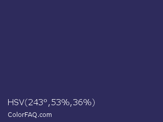 HSV 243°,53%,36% Color is a dark indigo color and the nearest color is Deep Koamaru #333366. Hex code #2e2b5c and RGB value is rgb(46,43,92). In RGB color space, this color is composed of 18% red, 17% green, 36% blue, In CMYK color space, this color is composed of 50% cyan, 53% magenta, 0% yellow , 64% black , In HSL color space, this color has a hue angle of 244° , 36% saturation and 26% lightness.