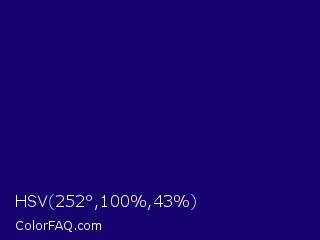 HSV 252°,100%,43% Color is a very dark indigo color and the nearest color is Arapawa #110c6c. Hex code #16006e and RGB value is rgb(22,0,110). In RGB color space, this color is composed of 9% red, 0% green, 43% blue, In CMYK color space, this color is composed of 80% cyan, 100% magenta, 0% yellow , 57% black , In HSL color space, this color has a hue angle of 252° , 100% saturation and 22% lightness.