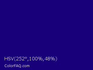 HSV 252°,100%,48% Color is a dark indigo color and the nearest color is Deep Blue #220878. Hex code #18007a and RGB value is rgb(24,0,122). In RGB color space, this color is composed of 9% red, 0% green, 48% blue, In CMYK color space, this color is composed of 80% cyan, 100% magenta, 0% yellow , 52% black , In HSL color space, this color has a hue angle of 252° , 100% saturation and 24% lightness.