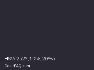 HSV 252°,19%,20% Color is a very dark indigo color and the nearest color is Baltic Sea #2a2630. Hex code #2b2933 and RGB value is rgb(43,41,51). In RGB color space, this color is composed of 17% red, 16% green, 20% blue, In CMYK color space, this color is composed of 16% cyan, 20% magenta, 0% yellow , 80% black , In HSL color space, this color has a hue angle of 252° , 11% saturation and 18% lightness.