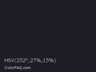 HSV 252°,27%,15% Color is a very dark indigo color and the nearest color is Raisin Black #242124. Hex code #1e1c26 and RGB value is rgb(30,28,38). In RGB color space, this color is composed of 12% red, 11% green, 15% blue, In CMYK color space, this color is composed of 21% cyan, 26% magenta, 0% yellow , 85% black , In HSL color space, this color has a hue angle of 252° , 15% saturation and 13% lightness.