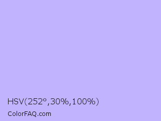 HSV 252°,30%,100% Color is a very light indigo color and the nearest color is Melrose #c7c1ff. Hex code #c2b3ff and RGB value is rgb(194,179,255). In RGB color space, this color is composed of 76% red, 70% green, 100% blue, In CMYK color space, this color is composed of 24% cyan, 30% magenta, 0% yellow , 0% black , In HSL color space, this color has a hue angle of 252° , 100% saturation and 85% lightness.