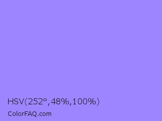 HSV 252°,48%,100% Color is a light indigo color and the nearest color is Dull Lavender #a899e6. Hex code #9d85ff and RGB value is rgb(157,133,255). In RGB color space, this color is composed of 62% red, 52% green, 100% blue, In CMYK color space, this color is composed of 38% cyan, 48% magenta, 0% yellow , 0% black , In HSL color space, this color has a hue angle of 252° , 100% saturation and 76% lightness.