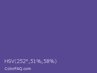 HSV 252°,51%,58% Color is a normal indigo color and the nearest color is Victoria #534491. Hex code #584894 and RGB value is rgb(88,72,148). In RGB color space, this color is composed of 35% red, 28% green, 58% blue, In CMYK color space, this color is composed of 41% cyan, 51% magenta, 0% yellow , 42% black , In HSL color space, this color has a hue angle of 253° , 35% saturation and 43% lightness.