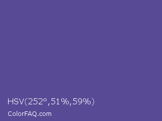 HSV 252°,51%,59% Color is a normal indigo color and the nearest color is Victoria #534491. Hex code #594a96 and RGB value is rgb(89,74,150). In RGB color space, this color is composed of 35% red, 29% green, 59% blue, In CMYK color space, this color is composed of 41% cyan, 51% magenta, 0% yellow , 41% black , In HSL color space, this color has a hue angle of 252° , 34% saturation and 44% lightness.