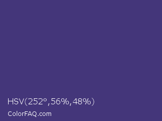 HSV 252°,56%,48% Color is a normal indigo color and the nearest color is Minsk #3f307f. Hex code #44367a and RGB value is rgb(68,54,122). In RGB color space, this color is composed of 27% red, 21% green, 48% blue, In CMYK color space, this color is composed of 44% cyan, 56% magenta, 0% yellow , 52% black , In HSL color space, this color has a hue angle of 252° , 39% saturation and 35% lightness.