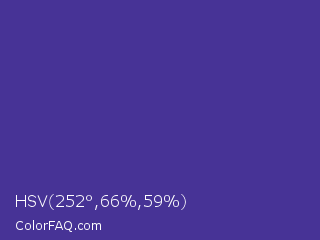 HSV 252°,66%,59% Color is a normal indigo color and the nearest color is Gigas #523c94. Hex code #473396 and RGB value is rgb(71,51,150). In RGB color space, this color is composed of 28% red, 20% green, 59% blue, In CMYK color space, this color is composed of 53% cyan, 66% magenta, 0% yellow , 41% black , In HSL color space, this color has a hue angle of 252° , 49% saturation and 39% lightness.
