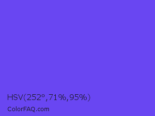 HSV 252°,71%,95% Color is a light indigo color and the nearest color is Majorelle Blue #6050dc. Hex code #6946f2 and RGB value is rgb(105,70,242). In RGB color space, this color is composed of 41% red, 27% green, 95% blue, In CMYK color space, this color is composed of 57% cyan, 71% magenta, 0% yellow , 5% black , In HSL color space, this color has a hue angle of 252° , 87% saturation and 61% lightness.