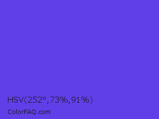 HSV 252°,73%,91% Color is a normal indigo color and the nearest color is Majorelle Blue #6050dc. Hex code #613fe8 and RGB value is rgb(97,63,232). In RGB color space, this color is composed of 38% red, 25% green, 91% blue, In CMYK color space, this color is composed of 58% cyan, 73% magenta, 0% yellow , 9% black , In HSL color space, this color has a hue angle of 252° , 79% saturation and 58% lightness.