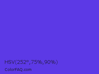 HSV 252°,75%,90% Color is a normal indigo color and the nearest color is Majorelle Blue #6050dc. Hex code #5c39e6 and RGB value is rgb(92,57,230). In RGB color space, this color is composed of 36% red, 22% green, 90% blue, In CMYK color space, this color is composed of 60% cyan, 75% magenta, 0% yellow , 10% black , In HSL color space, this color has a hue angle of 252° , 78% saturation and 56% lightness.