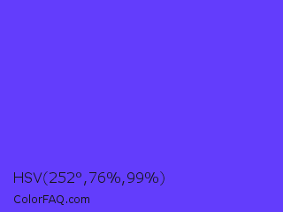 HSV 252°,76%,99% Color is a light indigo color and the nearest color is Majorelle Blue #6050dc. Hex code #633dfc and RGB value is rgb(99,61,252). In RGB color space, this color is composed of 39% red, 24% green, 99% blue, In CMYK color space, this color is composed of 61% cyan, 76% magenta, 0% yellow , 1% black , In HSL color space, this color has a hue angle of 252° , 97% saturation and 61% lightness.