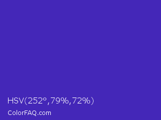 HSV 252°,79%,72% Color is a normal indigo color and the nearest color is Ocean Blue #4f42b5. Hex code #4427b8 and RGB value is rgb(68,39,184). In RGB color space, this color is composed of 27% red, 15% green, 72% blue, In CMYK color space, this color is composed of 63% cyan, 79% magenta, 0% yellow , 28% black , In HSL color space, this color has a hue angle of 252° , 65% saturation and 44% lightness.