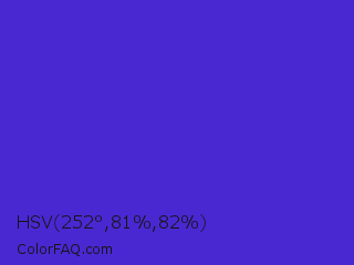 HSV 252°,81%,82% Color is a normal indigo color and the nearest color is Purple Heart Crayola #652dc1. Hex code #4a28d1 and RGB value is rgb(74,40,209). In RGB color space, this color is composed of 29% red, 16% green, 82% blue, In CMYK color space, this color is composed of 65% cyan, 81% magenta, 0% yellow , 18% black , In HSL color space, this color has a hue angle of 252° , 68% saturation and 49% lightness.