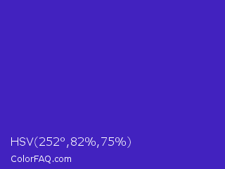 HSV 252°,82%,75% Color is a normal indigo color and the nearest color is Interdimensional Blue #360ccc. Hex code #4222bf and RGB value is rgb(66,34,191). In RGB color space, this color is composed of 26% red, 13% green, 75% blue, In CMYK color space, this color is composed of 65% cyan, 82% magenta, 0% yellow , 25% black , In HSL color space, this color has a hue angle of 252° , 70% saturation and 44% lightness.