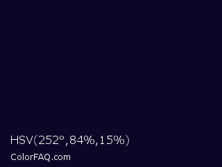 HSV 252°,84%,15% Color is a almost black indigo color and the nearest color is Deep Ebony #0c0b1d. Hex code #0d0626 and RGB value is rgb(13,6,38). In RGB color space, this color is composed of 5% red, 2% green, 15% blue, In CMYK color space, this color is composed of 66% cyan, 84% magenta, 0% yellow , 85% black , In HSL color space, this color has a hue angle of 253° , 73% saturation and 9% lightness.