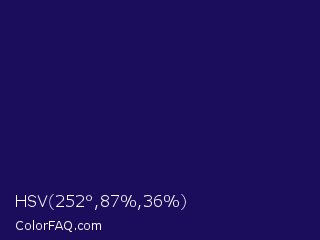 HSV 252°,87%,36% Color is a very dark indigo color and the nearest color is Violent Violet #290c5e. Hex code #1c0c5c and RGB value is rgb(28,12,92). In RGB color space, this color is composed of 11% red, 5% green, 36% blue, In CMYK color space, this color is composed of 70% cyan, 87% magenta, 0% yellow , 64% black , In HSL color space, this color has a hue angle of 252° , 77% saturation and 20% lightness.