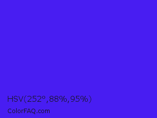 HSV 252°,88%,95% Color is a normal indigo color and the nearest color is Han Purple #5218fa. Hex code #481df2 and RGB value is rgb(72,29,242). In RGB color space, this color is composed of 28% red, 11% green, 95% blue, In CMYK color space, this color is composed of 70% cyan, 88% magenta, 0% yellow , 5% black , In HSL color space, this color has a hue angle of 252° , 89% saturation and 53% lightness.