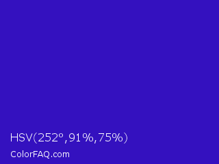 HSV 252°,91%,75% Color is a normal indigo color and the nearest color is Interdimensional Blue #360ccc. Hex code #3411bf and RGB value is rgb(52,17,191). In RGB color space, this color is composed of 20% red, 7% green, 75% blue, In CMYK color space, this color is composed of 73% cyan, 91% magenta, 0% yellow , 25% black , In HSL color space, this color has a hue angle of 252° , 84% saturation and 41% lightness.