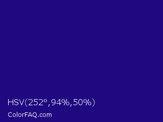 HSV 252°,94%,50% Color is a dark indigo color and the nearest color is Deep Blue #220878. Hex code #200880 and RGB value is rgb(32,8,128). In RGB color space, this color is composed of 13% red, 3% green, 50% blue, In CMYK color space, this color is composed of 75% cyan, 94% magenta, 0% yellow , 50% black , In HSL color space, this color has a hue angle of 252° , 88% saturation and 27% lightness.