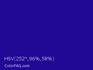 HSV 252°,96%,58% Color is a dark indigo color and the nearest color is Blue Gem #2c0e8c. Hex code #220694 and RGB value is rgb(34,6,148). In RGB color space, this color is composed of 13% red, 2% green, 58% blue, In CMYK color space, this color is composed of 77% cyan, 96% magenta, 0% yellow , 42% black , In HSL color space, this color has a hue angle of 252° , 92% saturation and 30% lightness.