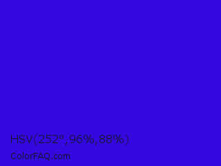 HSV 252°,96%,88% Color is a normal indigo color and the nearest color is Interdimensional Blue #360ccc. Hex code #3409e0 and RGB value is rgb(52,9,224). In RGB color space, this color is composed of 20% red, 4% green, 88% blue, In CMYK color space, this color is composed of 77% cyan, 96% magenta, 0% yellow , 12% black , In HSL color space, this color has a hue angle of 252° , 92% saturation and 46% lightness.