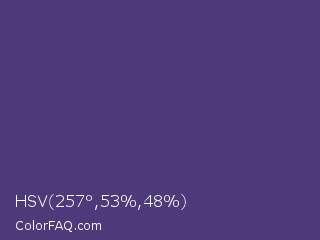HSV 257°,53%,48% Color is a normal indigo color and the nearest color is Cyber Grape #58427c. Hex code #4c3a7a and RGB value is rgb(76,58,122). In RGB color space, this color is composed of 30% red, 23% green, 48% blue, In CMYK color space, this color is composed of 38% cyan, 52% magenta, 0% yellow , 52% black , In HSL color space, this color has a hue angle of 257° , 36% saturation and 35% lightness.