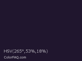 HSV 265°,53%,18% Color is a very dark violet color and the nearest color is Haiti #1b1035. Hex code #20162e and RGB value is rgb(32,22,46). In RGB color space, this color is composed of 13% red, 9% green, 18% blue, In CMYK color space, this color is composed of 30% cyan, 52% magenta, 0% yellow , 82% black , In HSL color space, this color has a hue angle of 265° , 35% saturation and 13% lightness.