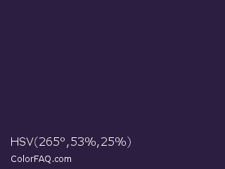 HSV 265°,53%,25% Color is a very dark violet color and the nearest color is Ebony Clay #26283b. Hex code #2c1e40 and RGB value is rgb(44,30,64). In RGB color space, this color is composed of 17% red, 12% green, 25% blue, In CMYK color space, this color is composed of 31% cyan, 53% magenta, 0% yellow , 75% black , In HSL color space, this color has a hue angle of 265° , 36% saturation and 18% lightness.