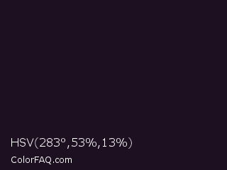 HSV 283°,53%,13% Color is a very dark purple color and the nearest color is Eerie Black #1b1b1b. Hex code #1c1021 and RGB value is rgb(28,16,33). In RGB color space, this color is composed of 11% red, 6% green, 13% blue, In CMYK color space, this color is composed of 15% cyan, 52% magenta, 0% yellow , 87% black , In HSL color space, this color has a hue angle of 282° , 35% saturation and 10% lightness.
