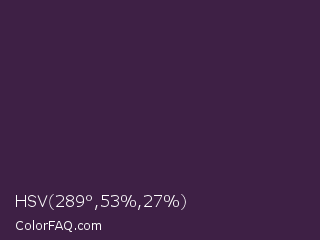 HSV 289°,53%,27% Color is a very dark purple color and the nearest color is Deep Grape #381a51. Hex code #3e2045 and RGB value is rgb(62,32,69). In RGB color space, this color is composed of 24% red, 13% green, 27% blue, In CMYK color space, this color is composed of 10% cyan, 54% magenta, 0% yellow , 73% black , In HSL color space, this color has a hue angle of 289° , 37% saturation and 20% lightness.
