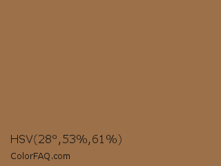 HSV 28°,53%,61% Color is a normal orange color and the nearest color is Dirt #9b7653. Hex code #9c7049 and RGB value is rgb(156,112,73). In RGB color space, this color is composed of 61% red, 44% green, 29% blue, In CMYK color space, this color is composed of 0% cyan, 28% magenta, 53% yellow , 39% black , In HSL color space, this color has a hue angle of 28° , 36% saturation and 45% lightness.