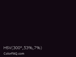 HSV 300°,53%,7% Color is a almost black magenta color and the nearest color is Woodsmoke #0c0d0f. Hex code #120812 and RGB value is rgb(18,8,18). In RGB color space, this color is composed of 7% red, 3% green, 7% blue, In CMYK color space, this color is composed of 0% cyan, 56% magenta, 0% yellow , 93% black , In HSL color space, this color has a hue angle of 300° , 38% saturation and 5% lightness.