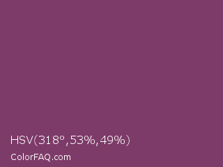 HSV 318°,53%,49% Color is a normal magenta color and the nearest color is Cosmic #76395d. Hex code #7d3b69 and RGB value is rgb(125,59,105). In RGB color space, this color is composed of 49% red, 23% green, 41% blue, In CMYK color space, this color is composed of 0% cyan, 53% magenta, 16% yellow , 51% black , In HSL color space, this color has a hue angle of 318° , 36% saturation and 36% lightness.