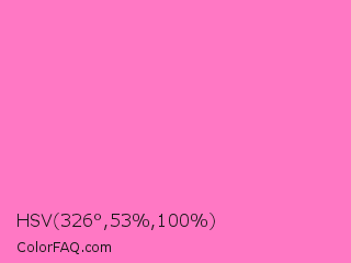 HSV 326°,53%,100% Color is a light magenta color and the nearest color is Persian Pink #f77fbe. Hex code #ff78c4 and RGB value is rgb(255,120,196). In RGB color space, this color is composed of 100% red, 47% green, 77% blue, In CMYK color space, this color is composed of 0% cyan, 53% magenta, 23% yellow , 0% black , In HSL color space, this color has a hue angle of 326° , 100% saturation and 74% lightness.