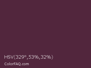 HSV 329°,53%,32% Color is a dark rose color and the nearest color is Wine Berry #591d35. Hex code #52263d and RGB value is rgb(82,38,61). In RGB color space, this color is composed of 32% red, 15% green, 24% blue, In CMYK color space, this color is composed of 0% cyan, 54% magenta, 26% yellow , 68% black , In HSL color space, this color has a hue angle of 329° , 37% saturation and 24% lightness.