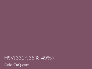 HSV 331°,35%,49% Color is a normal rose color and the nearest color is Deep Taupe #7e5e60. Hex code #7d5166 and RGB value is rgb(125,81,102). In RGB color space, this color is composed of 49% red, 32% green, 40% blue, In CMYK color space, this color is composed of 0% cyan, 35% magenta, 18% yellow , 51% black , In HSL color space, this color has a hue angle of 331° , 21% saturation and 40% lightness.