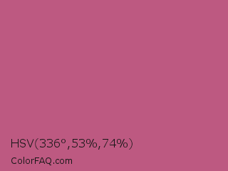 HSV 336°,53%,74% Color is a normal rose color and the nearest color is Tapestry #b05e81. Hex code #bd5981 and RGB value is rgb(189,89,129). In RGB color space, this color is composed of 74% red, 35% green, 51% blue, In CMYK color space, this color is composed of 0% cyan, 53% magenta, 32% yellow , 26% black , In HSL color space, this color has a hue angle of 336° , 43% saturation and 55% lightness.