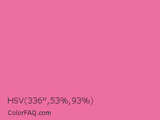 HSV 336°,53%,93% Color is a light rose color and the nearest color is Cyclamen #f56fa1. Hex code #ed6fa2 and RGB value is rgb(237,111,162). In RGB color space, this color is composed of 93% red, 44% green, 64% blue, In CMYK color space, this color is composed of 0% cyan, 53% magenta, 32% yellow , 7% black , In HSL color space, this color has a hue angle of 336° , 78% saturation and 68% lightness.