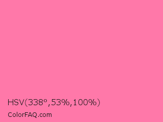 HSV 338°,53%,100% Color is a light rose color and the nearest color is Tickle Me Pink Crayola #fc80a5. Hex code #ff78a9 and RGB value is rgb(255,120,169). In RGB color space, this color is composed of 100% red, 47% green, 66% blue, In CMYK color space, this color is composed of 0% cyan, 53% magenta, 34% yellow , 0% black , In HSL color space, this color has a hue angle of 338° , 100% saturation and 74% lightness.