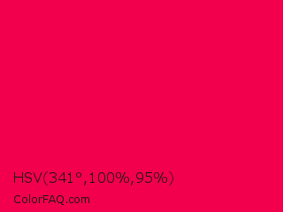 HSV 341°,100%,95% Color is a normal rose color and the nearest color is Folly #ff004f. Hex code #f2004d and RGB value is rgb(242,0,77). In RGB color space, this color is composed of 95% red, 0% green, 30% blue, In CMYK color space, this color is composed of 0% cyan, 100% magenta, 68% yellow , 5% black , In HSL color space, this color has a hue angle of 341° , 100% saturation and 47% lightness.