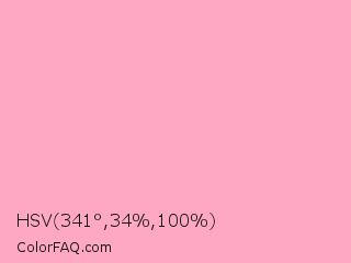 HSV 341°,34%,100% Color is a very light rose color and the nearest color is Carnation Pink #ffa6c9. Hex code #ffa8c4 and RGB value is rgb(255,168,196). In RGB color space, this color is composed of 100% red, 66% green, 77% blue, In CMYK color space, this color is composed of 0% cyan, 34% magenta, 23% yellow , 0% black , In HSL color space, this color has a hue angle of 341° , 100% saturation and 83% lightness.