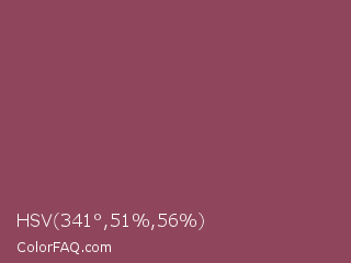 HSV 341°,51%,56% Color is a normal rose color and the nearest color is Cannon Pink #894367. Hex code #8f465d and RGB value is rgb(143,70,93). In RGB color space, this color is composed of 56% red, 27% green, 36% blue, In CMYK color space, this color is composed of 0% cyan, 51% magenta, 35% yellow , 44% black , In HSL color space, this color has a hue angle of 341° , 34% saturation and 42% lightness.