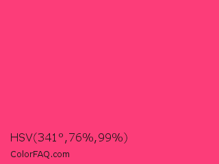 HSV 341°,76%,99% Color is a light rose color and the nearest color is Sasquatch Socks #ff4681. Hex code #fc3d79 and RGB value is rgb(252,61,121). In RGB color space, this color is composed of 99% red, 24% green, 47% blue, In CMYK color space, this color is composed of 0% cyan, 76% magenta, 52% yellow , 1% black , In HSL color space, this color has a hue angle of 341° , 97% saturation and 61% lightness.