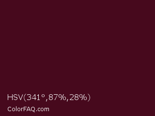 HSV 341°,87%,28% Color is a very dark rose color and the nearest color is Cab Sav #4d0a18. Hex code #47091d and RGB value is rgb(71,9,29). In RGB color space, this color is composed of 28% red, 4% green, 11% blue, In CMYK color space, this color is composed of 0% cyan, 87% magenta, 59% yellow , 72% black , In HSL color space, this color has a hue angle of 341° , 78% saturation and 16% lightness.
