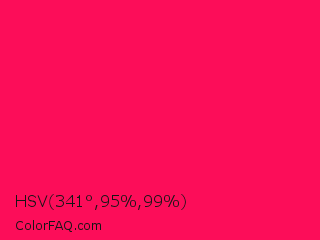 HSV 341°,95%,99% Color is a normal rose color and the nearest color is Folly #ff004f. Hex code #fc0d59 and RGB value is rgb(252,13,89). In RGB color space, this color is composed of 99% red, 5% green, 35% blue, In CMYK color space, this color is composed of 0% cyan, 95% magenta, 65% yellow , 1% black , In HSL color space, this color has a hue angle of 341° , 98% saturation and 52% lightness.